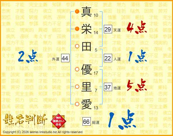 真(10画)栄(14画)田(5画) 優(17画)里(7画)愛(13画)