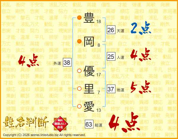 豊(18画)岡(8画) 優(17画)里(7画)愛(13画)
