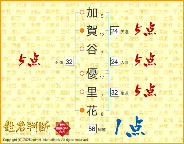 加(5画)賀(12画)谷(7画) 優(17画)里(7画)花(8画)