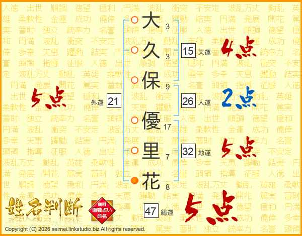 大(3画)久(3画)保(9画) 優(17画)里(7画)花(8画)