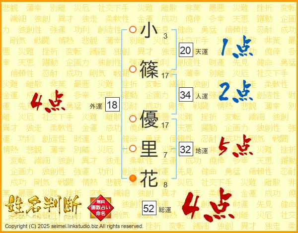 小(3画)篠(17画) 優(17画)里(7画)花(8画)