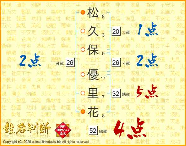松(8画)久(3画)保(9画) 優(17画)里(7画)花(8画)