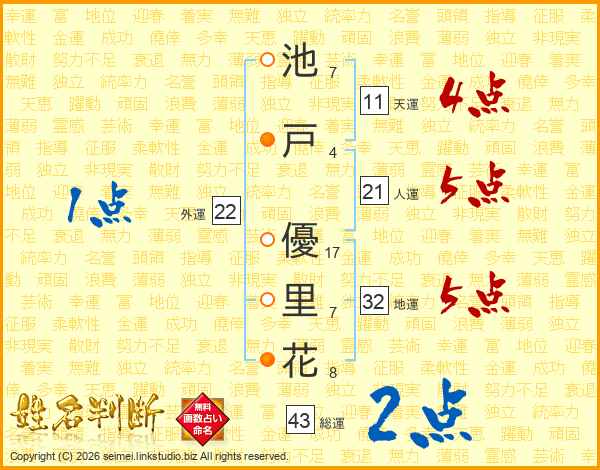 池(7画)戸(4画) 優(17画)里(7画)花(8画)