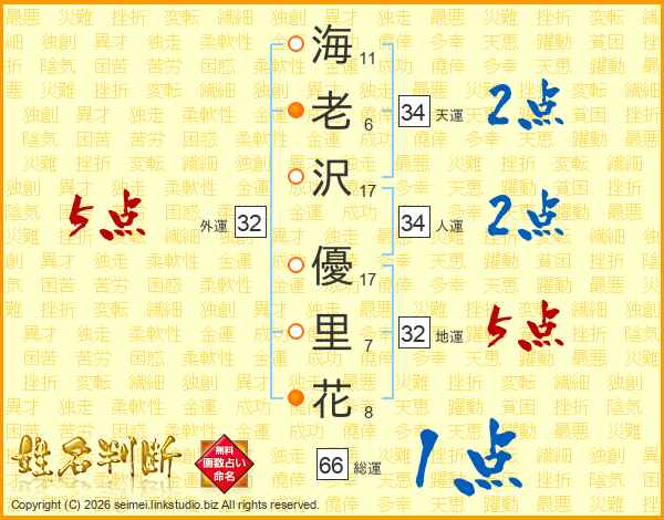 海(11画)老(6画)沢(17画) 優(17画)里(7画)花(8画)