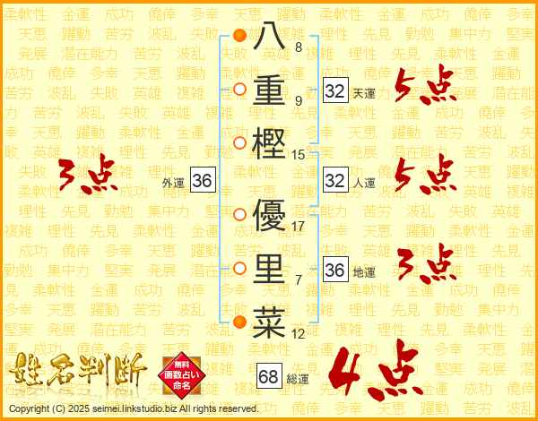 八(8画)重(9画)樫(15画) 優(17画)里(7画)菜(12画)