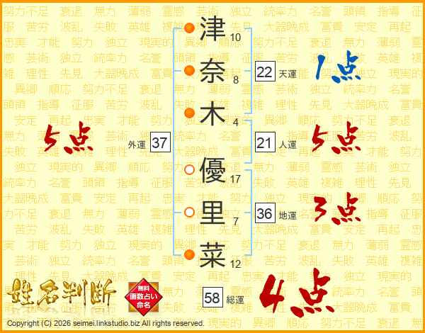 津(10画)奈(8画)木(4画) 優(17画)里(7画)菜(12画)