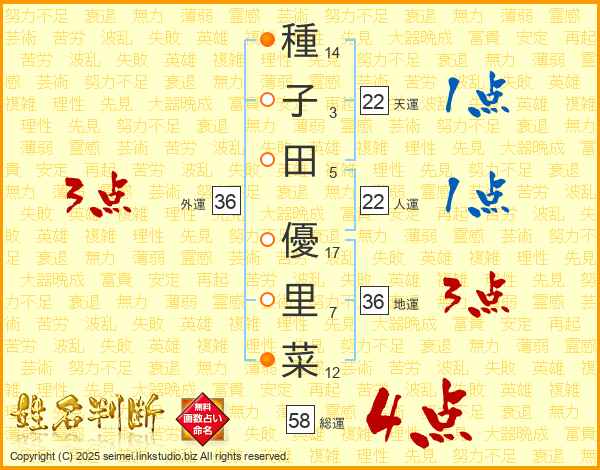 種子田優里菜さんの総運は58画の4点!