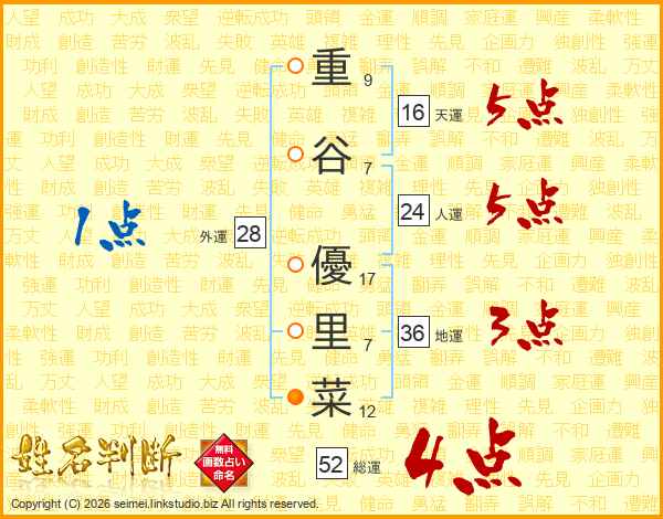 重(9画)谷(7画) 優(17画)里(7画)菜(12画)