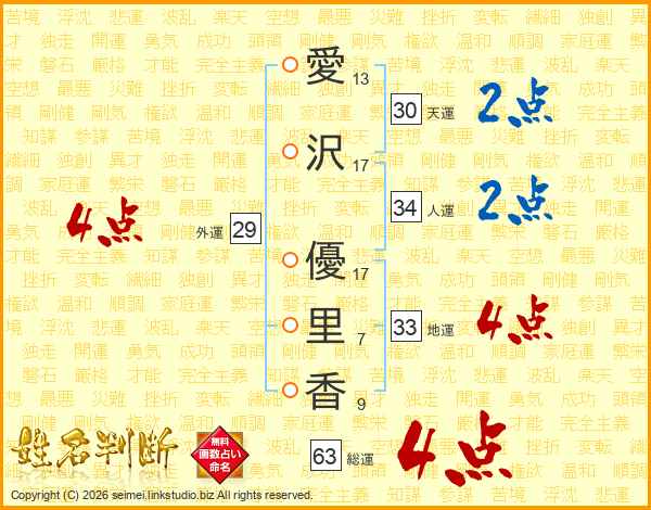 愛沢優里香さんの総運は63画の4点!