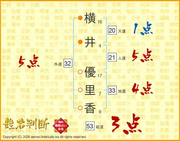 横(16画)井(4画) 優(17画)里(7画)香(9画)