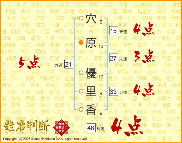 穴(5画)原(10画) 優(17画)里(7画)香(9画)