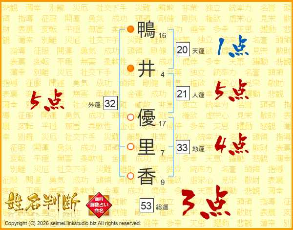 鴨(16画)井(4画) 優(17画)里(7画)香(9画)