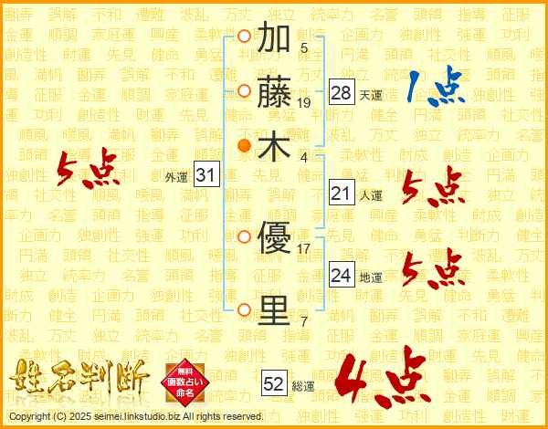 加(5画)藤(19画)木(4画) 優(17画)里(7画)