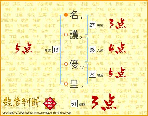 生活面を象徴する運勢です。外部から受ける影響力を表し、結婚運、家庭運や職場、環境への順応性を表します。総運から人運を引いた画数。姓や名が1文字の場合を除く。