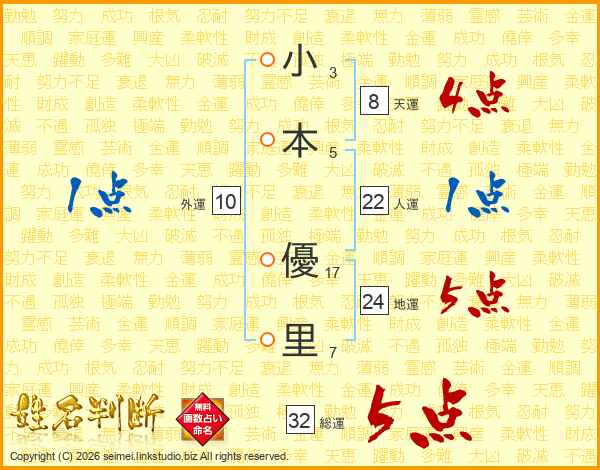 小(3画)本(5画) 優(17画)里(7画)