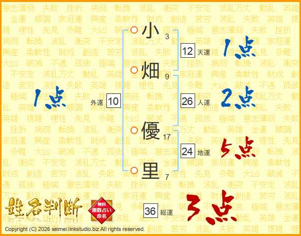 生活面を象徴する運勢です。外部から受ける影響力を表し、結婚運、家庭運や職場、環境への順応性を表します。総運から人運を引いた画数。姓や名が1文字の場合を除く。