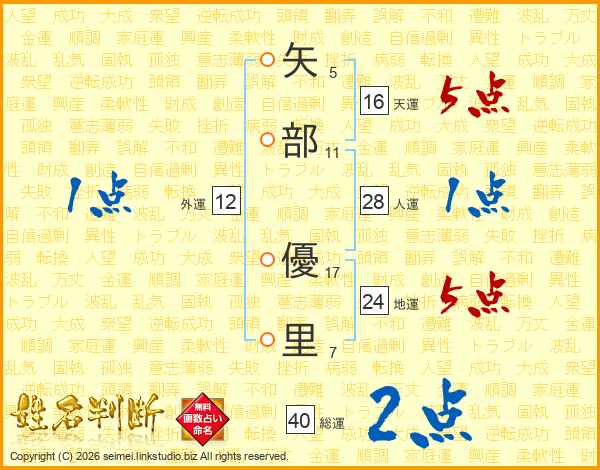 生活面を象徴する運勢です。外部から受ける影響力を表し、結婚運、家庭運や職場、環境への順応性を表します。総運から人運を引いた画数。姓や名が1文字の場合を除く。