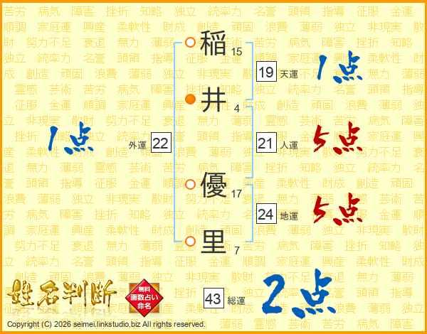 生活面を象徴する運勢です。外部から受ける影響力を表し、結婚運、家庭運や職場、環境への順応性を表します。総運から人運を引いた画数。姓や名が1文字の場合を除く。