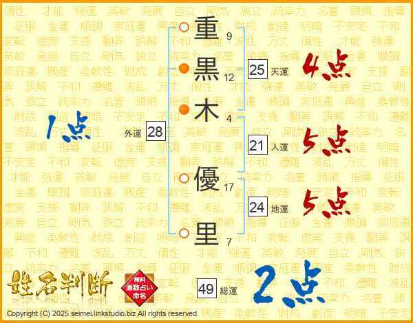 重(9画)黒(12画)木(4画) 優(17画)里(7画)