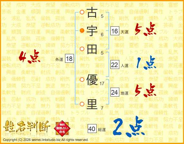古(5画)宇(6画)田(5画) 優(17画)里(7画)