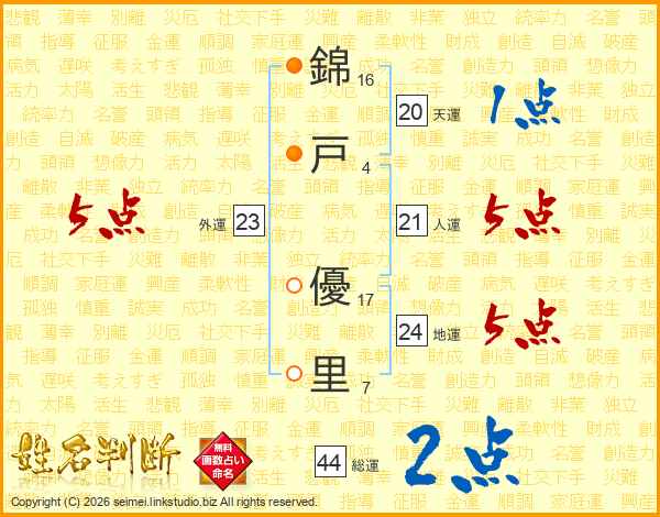 錦(16画)戸(4画) 優(17画)里(7画)