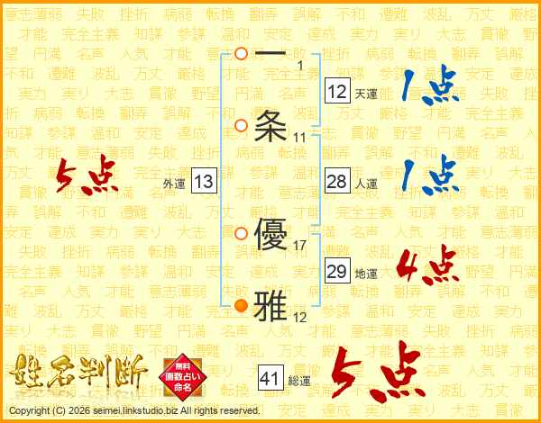 あなたの人生を表す1番重要な運勢です。生涯を通じて影響する総合運となり、主に50歳以降の晩年期に影響を及ぼします。苗字と名前の合計画数。