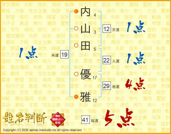 内(4画)山(3画)田(5画) 優(17画)雅(12画)