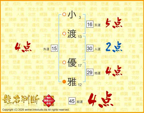 小渡優雅さんの総運は45画の4点!