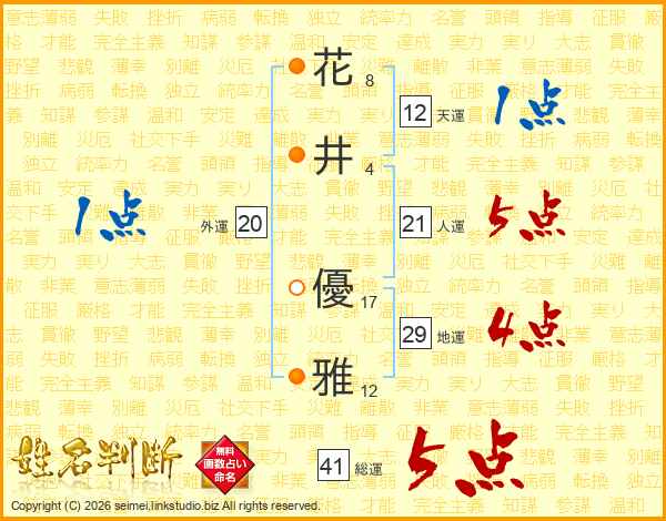 生活面を象徴する運勢です。外部から受ける影響力を表し、結婚運、家庭運や職場、環境への順応性を表します。総運から人運を引いた画数。姓や名が1文字の場合を除く。