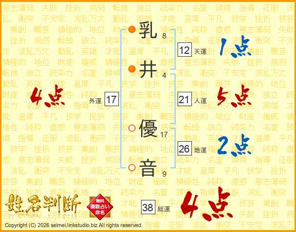 乳井優音さんの地運は26画の2点!