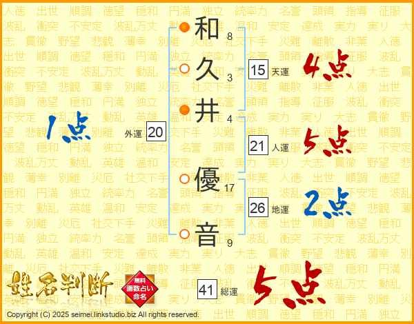 和(8画)久(3画)井(4画) 優(17画)音(9画)