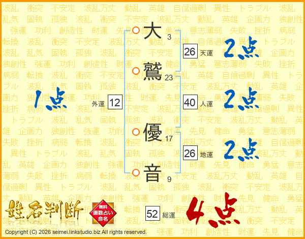 大鷲優音さんの総運は52画の4点!