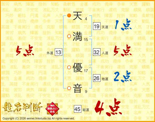 あなたの人生を表す1番重要な運勢です。生涯を通じて影響する総合運となり、主に50歳以降の晩年期に影響を及ぼします。苗字と名前の合計画数。