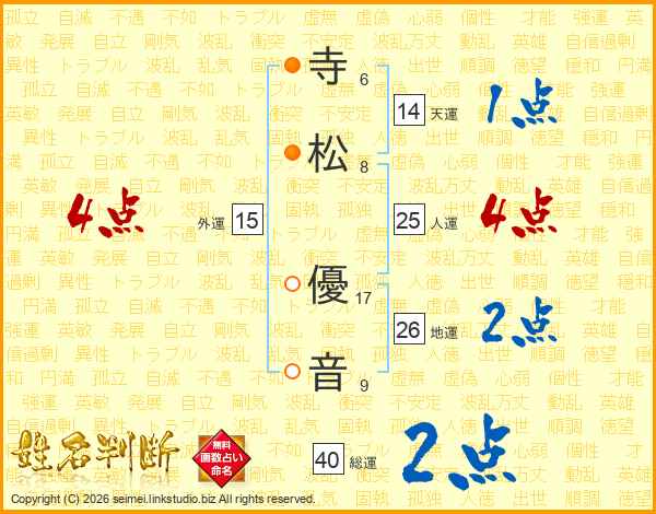寺(6画)松(8画) 優(17画)音(9画)