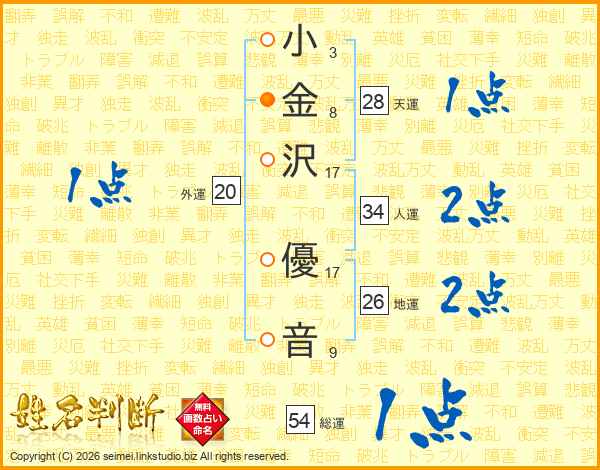 小(3画)金(8画)沢(17画) 優(17画)音(9画)