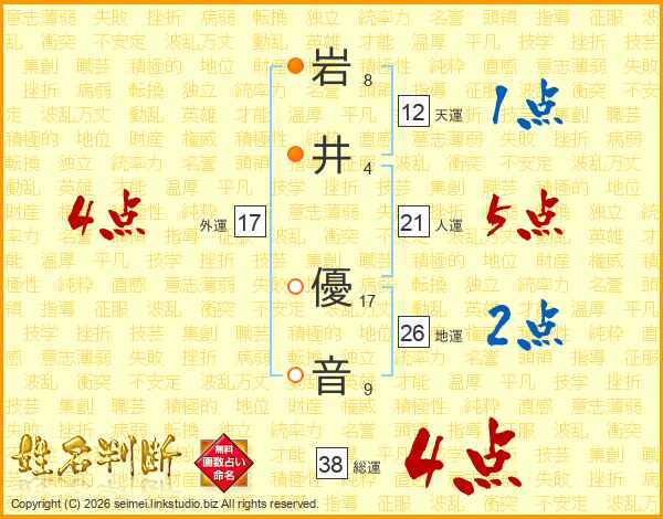 岩(8画)井(4画) 優(17画)音(9画)