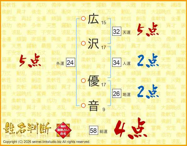 生活面を象徴する運勢です。外部から受ける影響力を表し、結婚運、家庭運や職場、環境への順応性を表します。総運から人運を引いた画数。姓や名が1文字の場合を除く。
