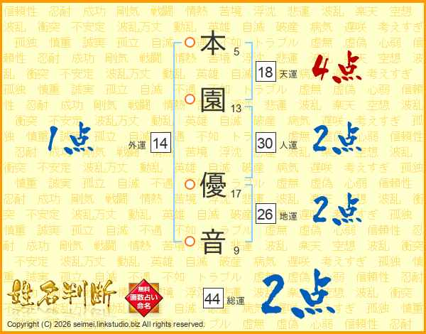 生活面を象徴する運勢です。外部から受ける影響力を表し、結婚運、家庭運や職場、環境への順応性を表します。総運から人運を引いた画数。姓や名が1文字の場合を除く。