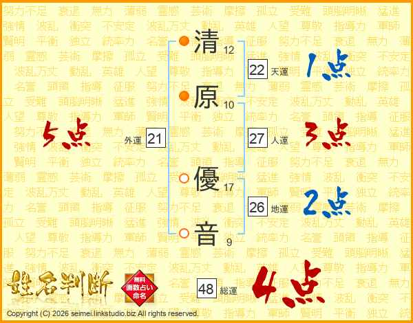 あなたの人生を表す1番重要な運勢です。生涯を通じて影響する総合運となり、主に50歳以降の晩年期に影響を及ぼします。苗字と名前の合計画数。