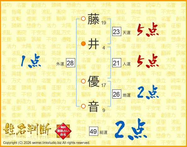 生活面を象徴する運勢です。外部から受ける影響力を表し、結婚運、家庭運や職場、環境への順応性を表します。総運から人運を引いた画数。姓や名が1文字の場合を除く。