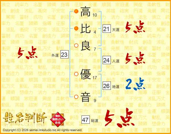 高(10画)比(4画)良(7画) 優(17画)音(9画)