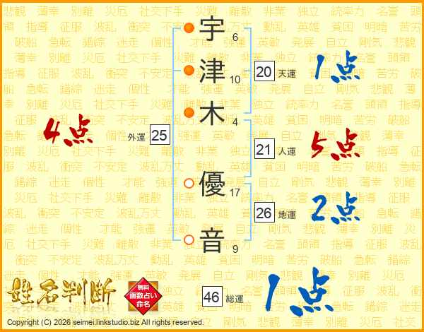 宇(6画)津(10画)木(4画) 優(17画)音(9画)