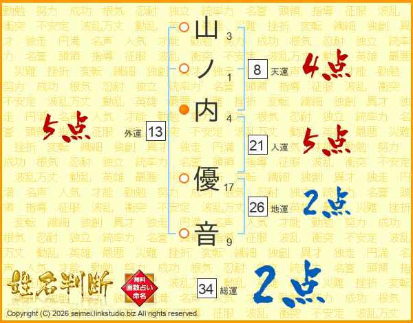 山(3画)ノ(1画)内(4画) 優(17画)音(9画)