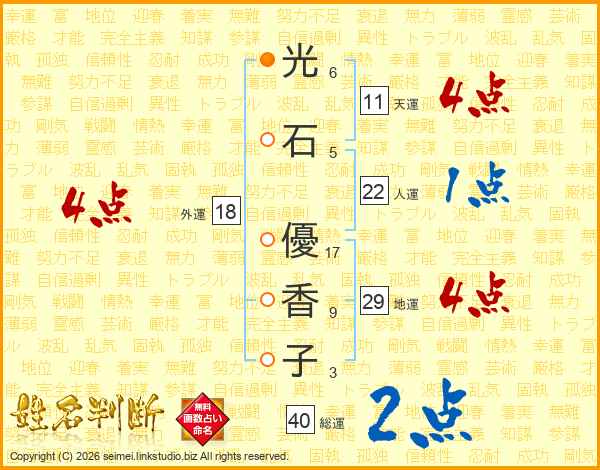 光(6画)石(5画) 優(17画)香(9画)子(3画)