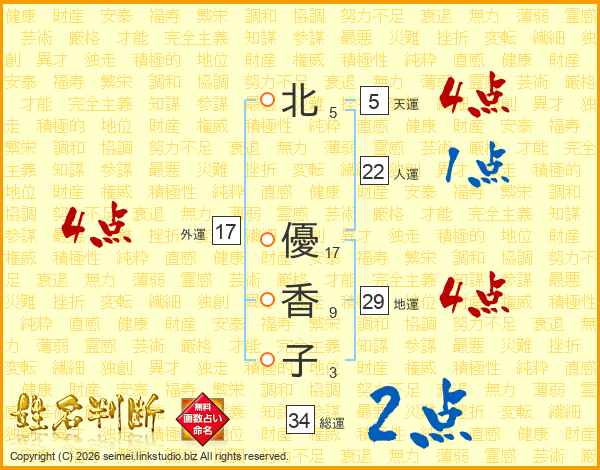 北(5画) 優(17画)香(9画)子(3画)