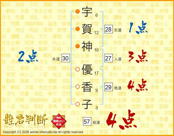 宇(6画)賀(12画)神(10画) 優(17画)香(9画)子(3画)