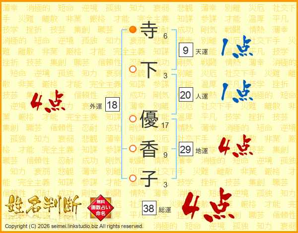 寺(6画)下(3画) 優(17画)香(9画)子(3画)