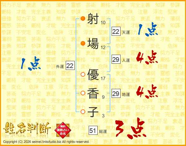 射(10画)場(12画) 優(17画)香(9画)子(3画)