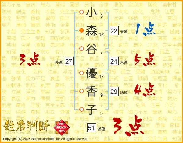 小(3画)森(12画)谷(7画) 優(17画)香(9画)子(3画)