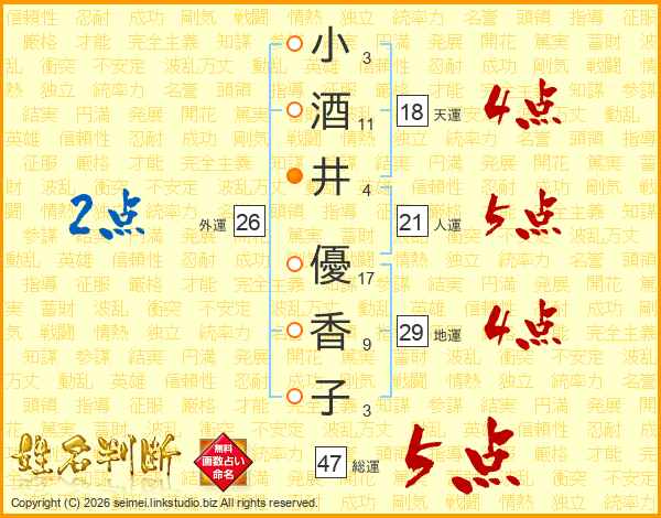 小酒井優香子さんの総運は47画の5点!
